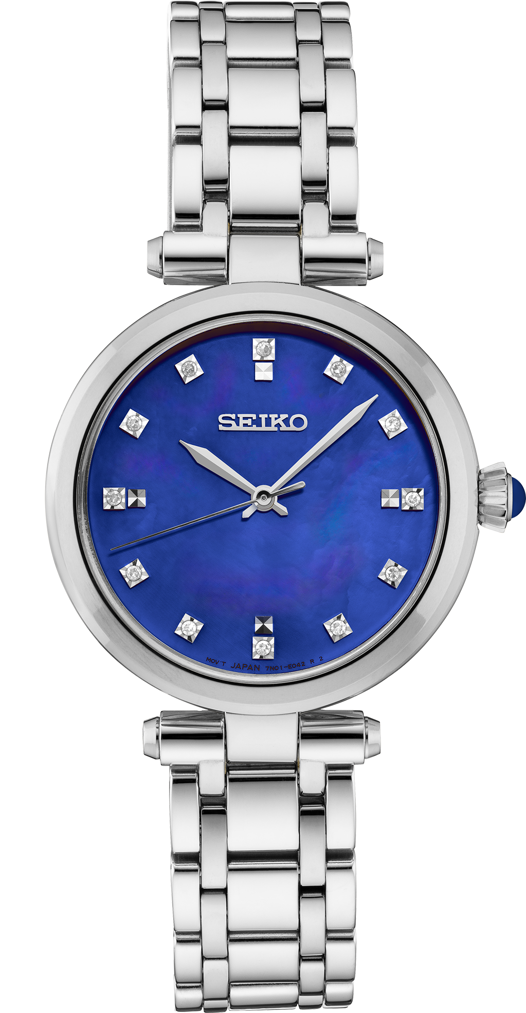 Drawing inspiration from fine jewelry, this versatile design, perfect for dress or everyday wear, features an elegant blue mother-of-pearl dial with 12 diamonds as hour markers, gracefully shaped hands and a classic blue cabochon crown. In stainless steel, with a sapphire crystal for superior scratch resistance. 5 bar, 50M Water Resistant