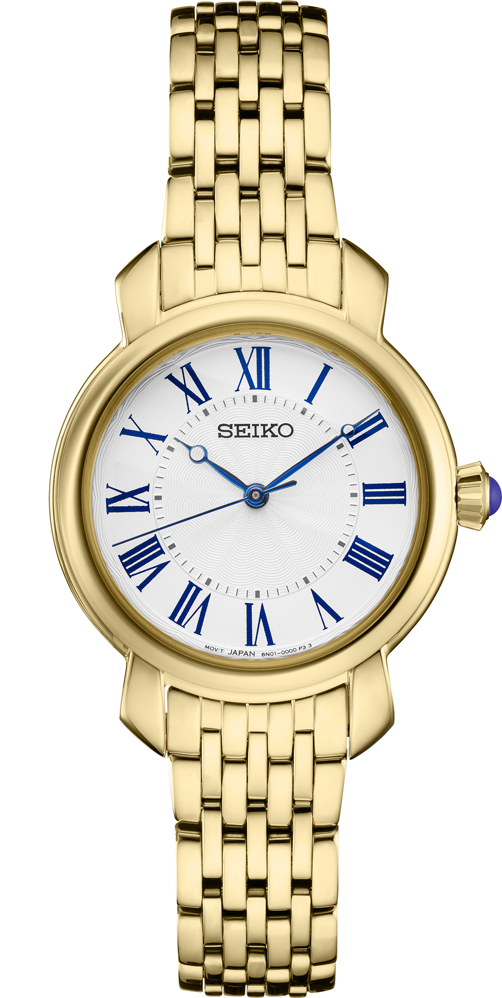 • White dial• Roman numeral markers• Blue cabochon crown• Case diameter: 29.2mm • Gold-tone stainless steel case and bracelet• Water-resistant to 5 bar, 50 meters (165 feet)• Caliber 6N01