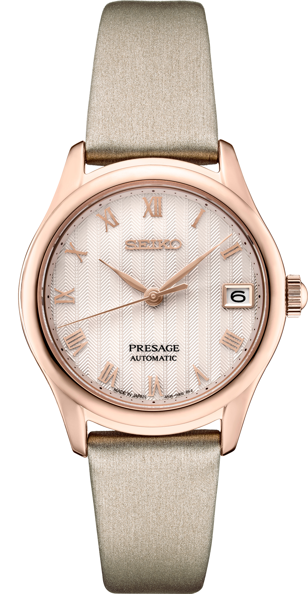 Offering the finest in Japanese mechanical watchmaking, the Presage Collection blends precision technology with superior craftsmanship and design. Adding a feminine note to a group inspired by the serenity of a traditional Japanese garden, this elegantly curved timepiece, in stainless steel with rich rose gold finish, features a white dial tinged with a pink reminiscent of cherry blossoms, subtly patterned to evoke the delicate raking of these unique havens. Rose gold accents, framing the date calendar and forming the hands and classic Roman numeral markers, add warmth and depth. The screwdown see-through caseback provides a view of the 23-jewel movement with manual and automatic winding capability, a frequency of 21,600 vibrations per hour and a power reserve of approximately 41 hours. With dual-curved sapphire crystal, satin-finish taupe leather strap and tri-fold push button release clasp. 3 bar, 30M Water Resistant