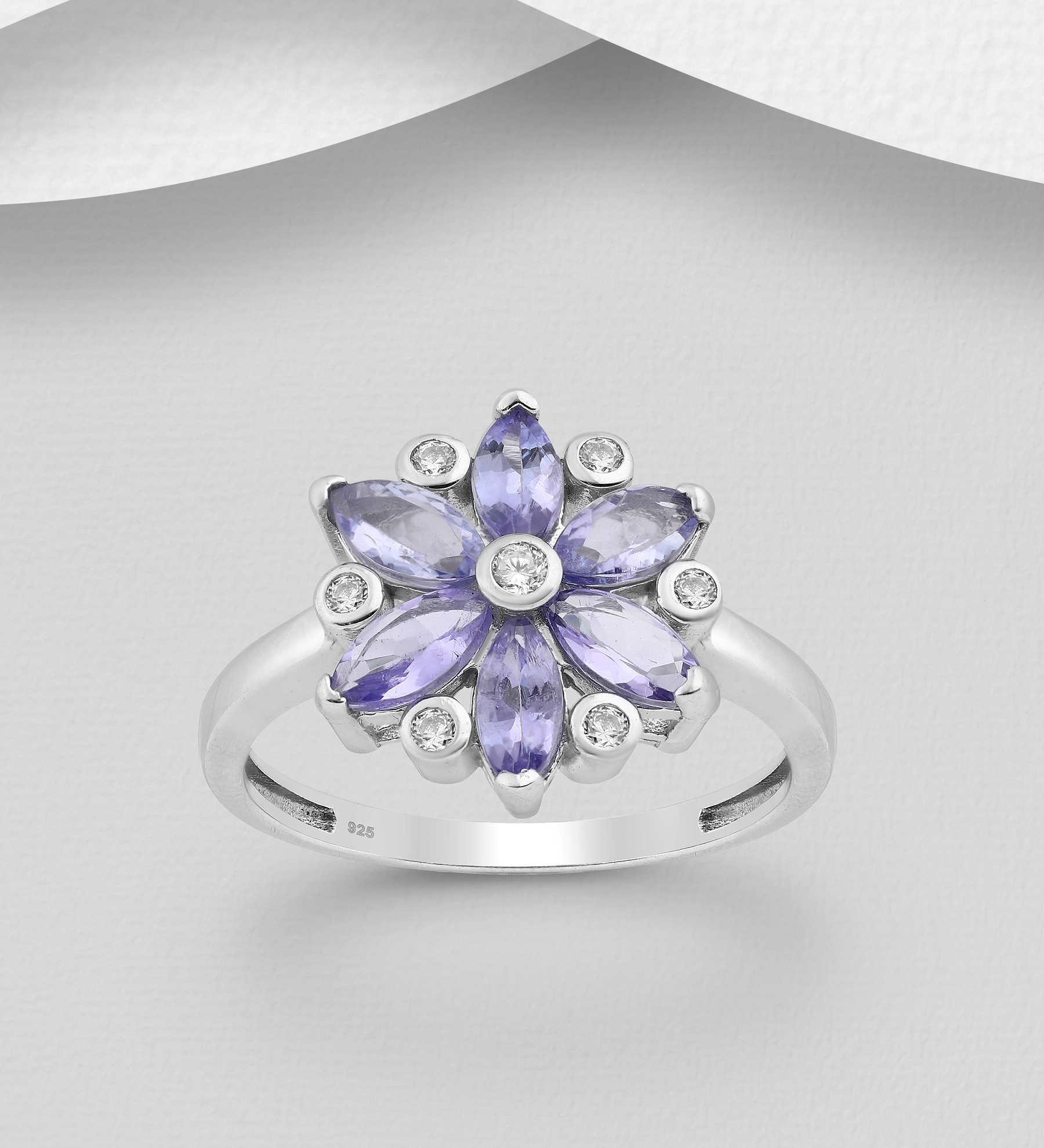 925 Sterling Silver Flower Ring Decorated with Tanzanite and CZ Simulated Diamonds. Cannot be special ordered. Production orders available.